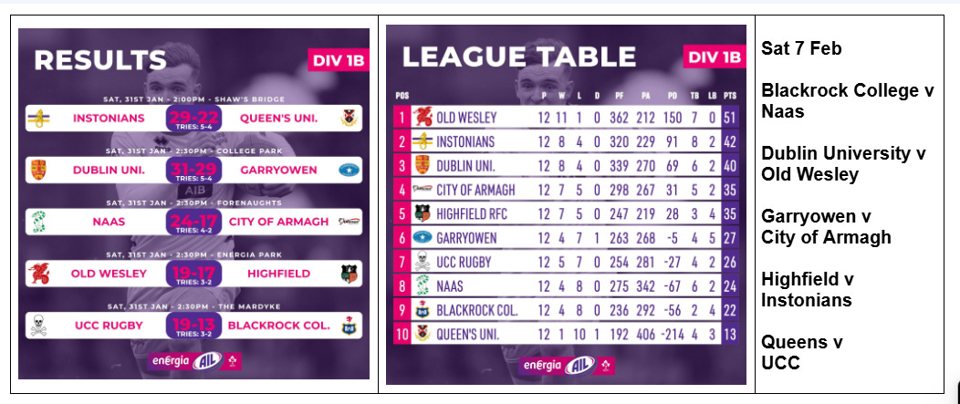 Also February is the time of year when we add the Division 1B updates to this section, Old Wesley are leading the way although they’ve a tough assignment up next away to Trinity who are also near the top.