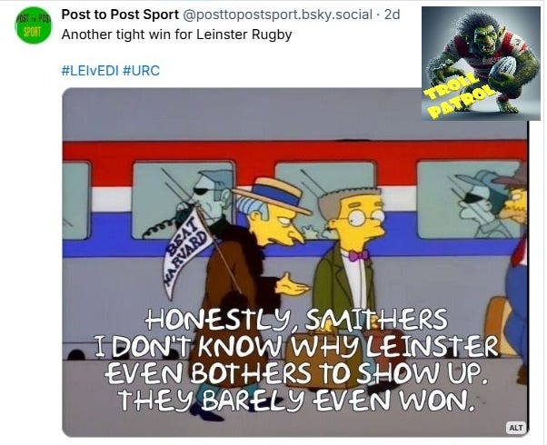 Owner/operator of Post To Post Sport and regular Harpin contributor Ciarán Duffy decided to go the Simpsons meme route to celebrate Leinster’s latest victory…