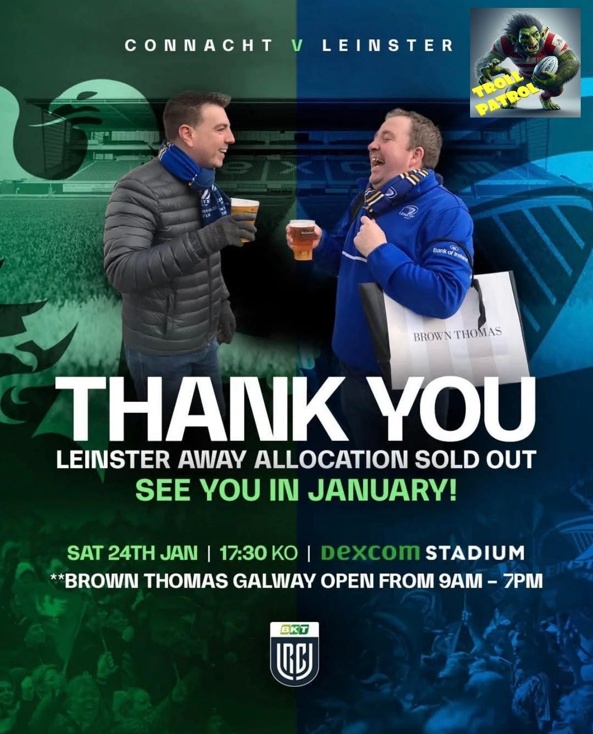 I don’t think I have ever “recycled” a troll for this section before but in this case I reckon it’s worth it, even if Connacht are my second favourite province. They knew what they were doing with this, and it did raise a smile at the time, but given how the two matches in January panned out (where one might say Leinster have 10 URC points in that BT bag), I reckon a callback is in order.