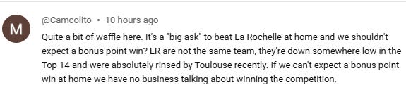 It sounds very patronizing I know, but when they’re not playing Leinster I always want Connacht to do well and I really think Stu Lancaster can be a great fit for them given time. But they can be sooooo frustrating to watch, with a pivotal moment of their season being a tap n go penalty 5m from the Ospreys line back in December where they forgot the tap part (I won’t name check the player) and the error saw them go from a BP away win to being grateful to leave Swansea with just the one point. The fifty-burger in Galway against Black Lion a week later might have helped with morale until a pasting in Newport followed by back to back interpro defeats left Stu’s first season in tatters. Sadly depth has always been their issue - when fit their first choice XV will always compete well but when the inevitable injuries hit, especially multiple ones in the same areas as shown by the quote, they’re going to struggle.