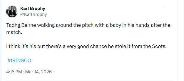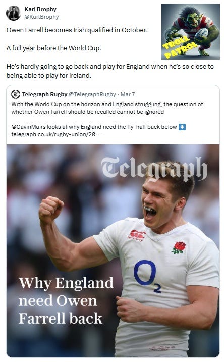 Karl Brophy is on flying form on the socials these days and accounts like his make it worthwhile to wade through all the shite you get on there. This “could Owen qualify for Ireland” troll was so good it prompted reactions from people like Stu Barnes, which allows him to reply with the emoji “🎣”