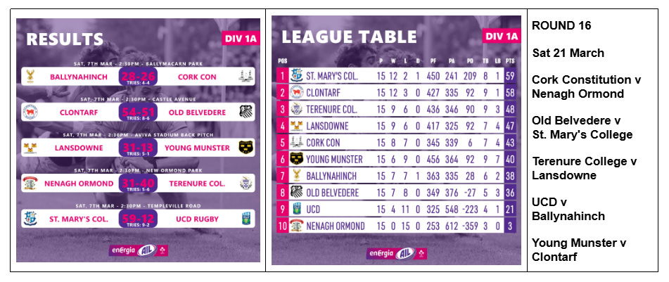 I harp a lot about the Women’s AIL in this section and there’s nothing wrong about that, but I suppose once in a while I should throw the spotlight on the blokes and there’s a big match in Div 1A this weekend. Not only is Terenure v Lansdowne a Dublin derby anyway, but they also sit 3rd and 4th respectively and with Cork Con in 5th likely to get maximum points from winless Nenagh Ormond, the points will be vital at Lakelands if they want to cement their playoff hopes with one round left after this.